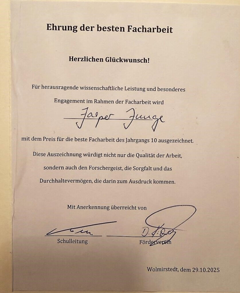 Am 29. Oktober 2025 traten Jasper Junge, Mia-Selina Plomitzer und Rehan Tekman mit ihren Präsentationen vor eine Jury und ein Auditorium aus Schülerinnen und Schülern der jetzigen 10. Klassen, die im laufenden Schuljahr ihre Facharbeit bearbeiten werden und sich hier wertvolle Hinweise für die anstehenden eigenen Präsentationen holen konnten.